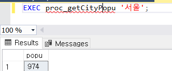 execute @popu = proc_RetCityPopu '서울';