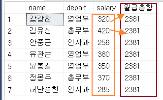 select name, depart, salary, sum(salary) over() as 월급총합 from tStaff;