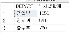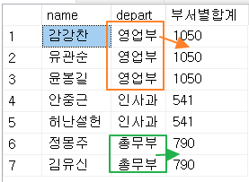select name, depart, salary, sum(salary) over(partition by depart) as 부서월급총합 from tStaff;