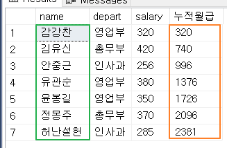 select name, depart, salary, sum(salary) over(order by name) as 누적월급 from tStaff;
