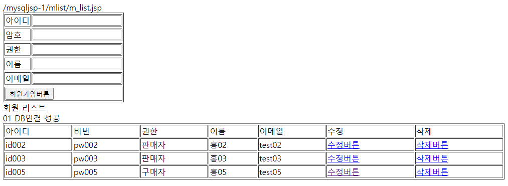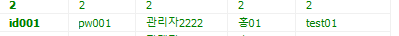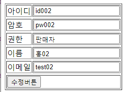 <td>아이디</td><td>비번</td><td>권한</td><td>이름</td><td>이메일</td><td>수정</td><td>삭제</td>