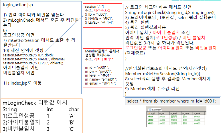 1) 로그인 성공시 : mLoginCheck 메서드의 아이디, 비밀번호가 일치했을 때의 리턴값을 받아온다.