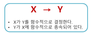 - 릴레이션에서 속성 집합 Y가 속성 집합 X에 함수적으로 종속되어 있지만,