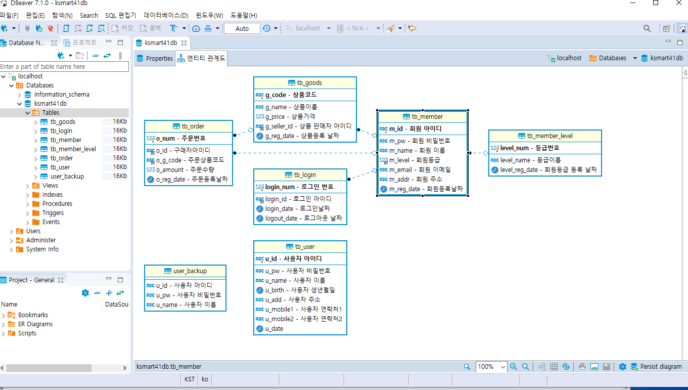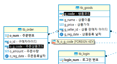 5. 테이블 연결선 클릭 -> 관련되어 있는 키 보여줌.