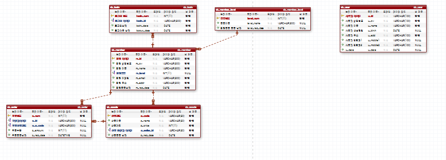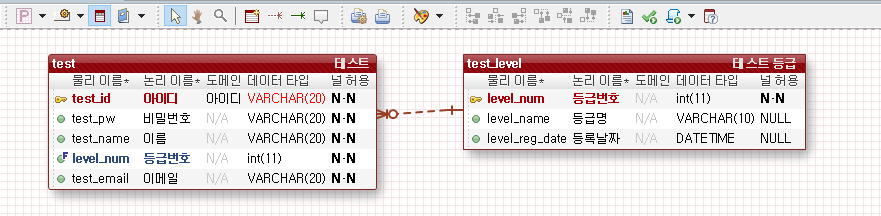 관계설정은 참조되는 테이블의 기본키를 클릭하고 참조하는 테이블의 외래키/기본키 선택.
