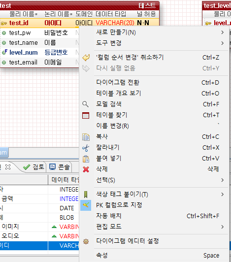 5. 기본키 설정 : 테이블 우클릭 -> pk 컬럼으로 지정