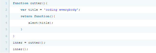하지만 8행에서 함수 inner를 실행했을 때 coding everybody가 출력된 것은 외부함수의 지역변수 title이 소멸되지 않았다는 것을 의미한다.
