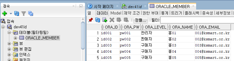 insert into oracle_member values('id001','pw001','관리자','홍01','001@ksmart.or.kr');