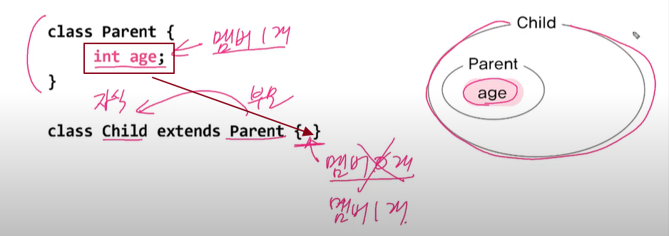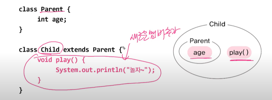 - 상속 방법 : class 클래스(자식) extends 클래스(부모)
