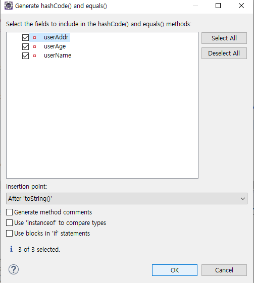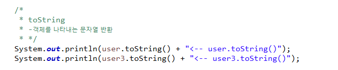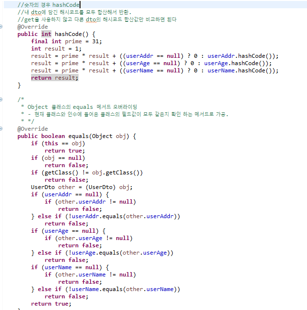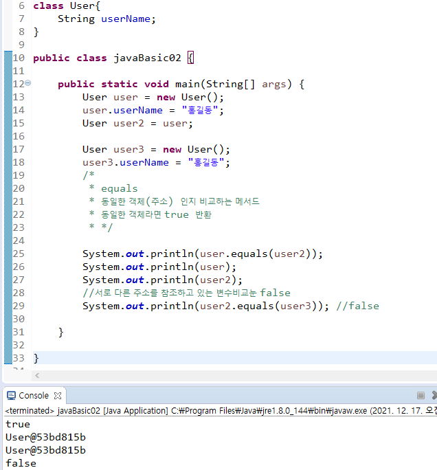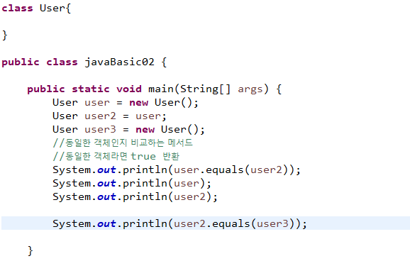 - 오브젝트 클래스의 equals : 동일한 객체(주소) 인지 비교하는 메서드