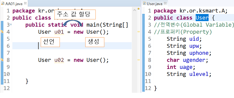 1) User Class data type으로 u01객체참조변수를 선언한다.