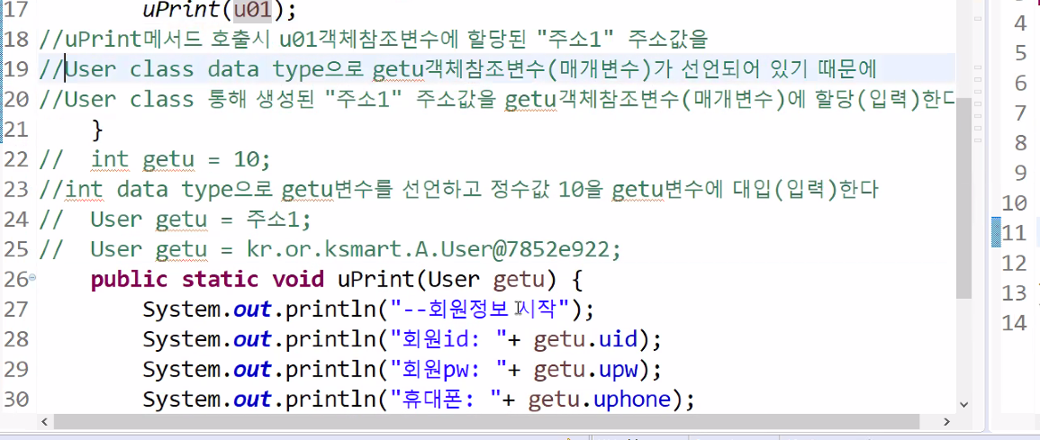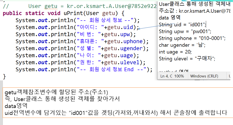 uPrint(User getu) : User 데이터타입클래스의 매개변수 getu를 객체참조변수 getu로 선언한다.