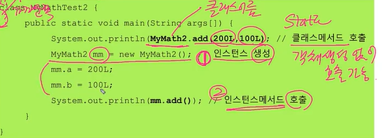 인스턴스 메서드는 1. new로 객체생성 2. mm 객체참조변수.메서드 이름()으로 호출했다.