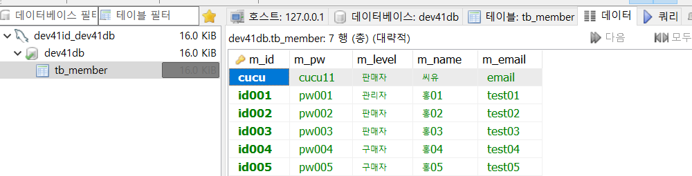 7. 테이블에 insert, update, delete, select 할 수 있다.