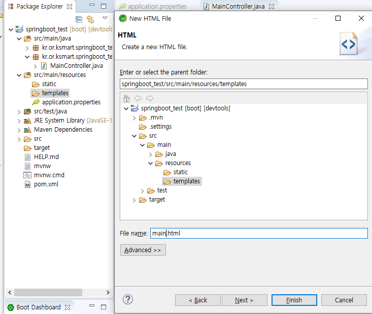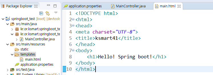 탬플릿 -> 오른쪽 클릭 -> other -> html -> main.html 생성