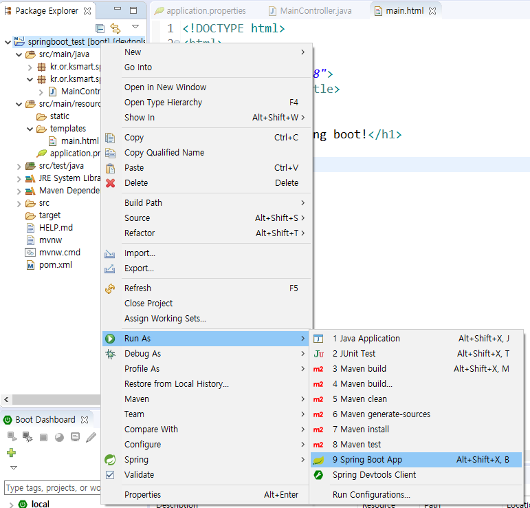 상위 폴더 오른쪽 클릭 -> RUN AS -> Spring boot app 실행!