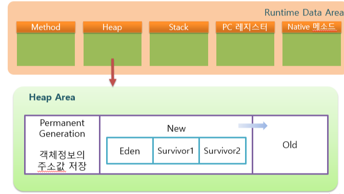 객체를 생성할 때 필요한 정보를 저장하는 공간인 permanent 영역, 객체가 생성되는 new영역, 생성된 객체를 오랫동안 참조할 가능성이 있는 객체들을 저장하는 공간이 old영역입니다.