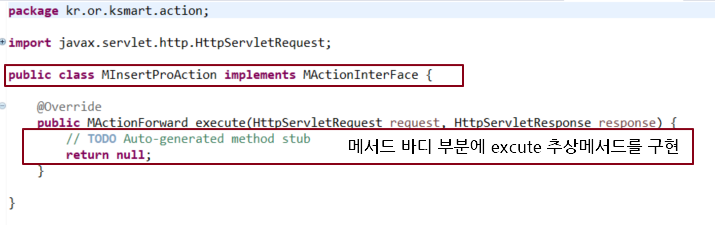5. MActionInterFace 인터페이스로 부터 구현을 명령받아 execute 추상메서드를 구현 한다.