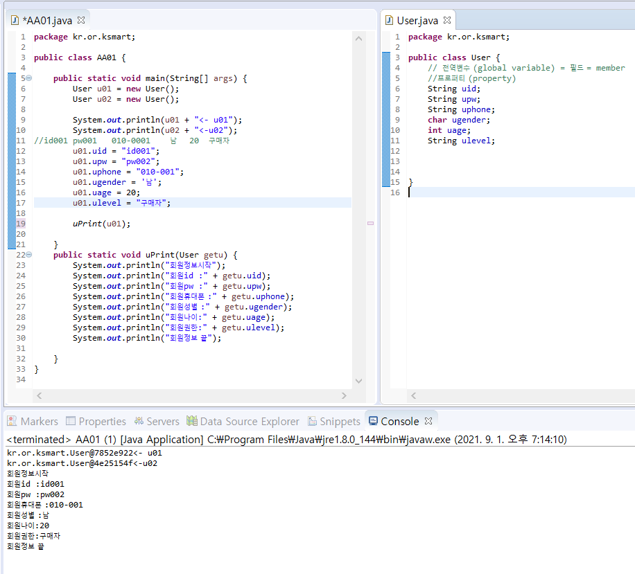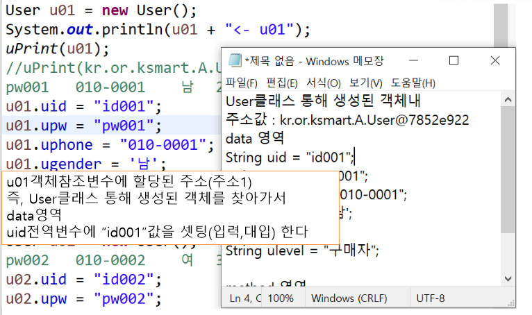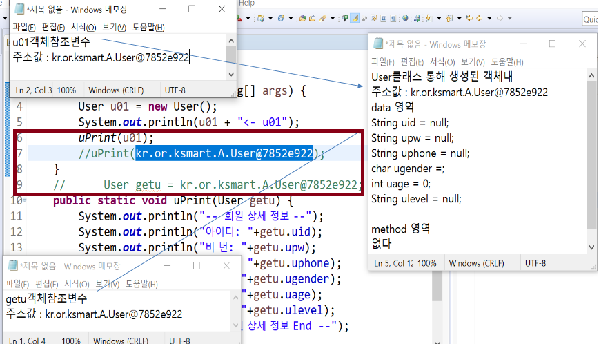 1) User Class data type으로 u01객체참조변수를 선언한다.